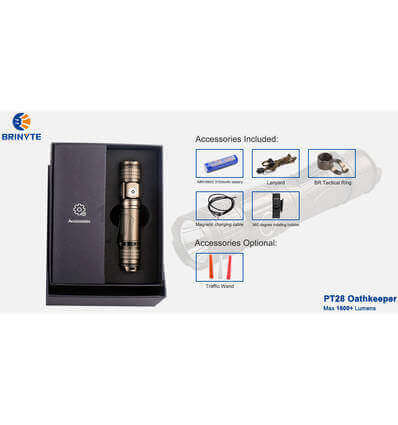BRINYTE PT28 Oathkeeper is a palm-sized tactical flashlight for military, law enforcement officers and outdoor sportsmen. Its maximum output can reach 1600+ lumens with its imported CREE LED. Four different brightnesses and two function modes, enough to handle any requirement of lighting. Magnetic charging port design, easy to charge. Featuring intelligent power indicator, the PT28 Oathkeeper is the lighting device of choice for law enforcement officers and outdoor sports enthusiasts.