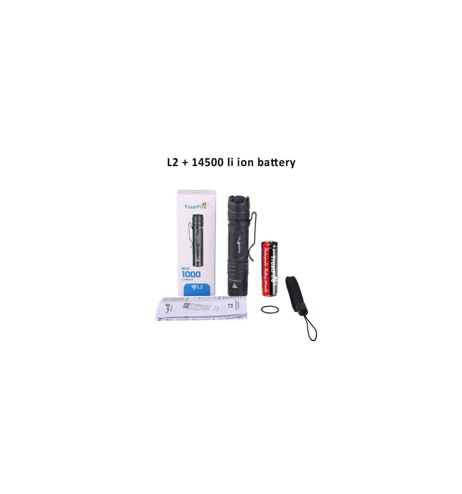 Package Included: 1* TrustFire L2 Flashlight,1 x AA Alkaline Battery (Optional), 1* Lanyard, 1* Replacement O-Ring, 1* User Manual.